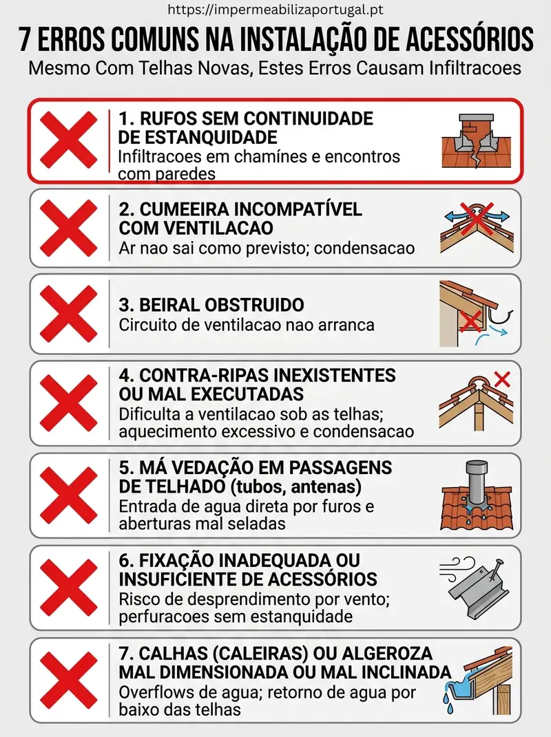 Estes erros explicam muitos casos em que “as telhas são novas” e mesmo assim há infiltração ou humidade.