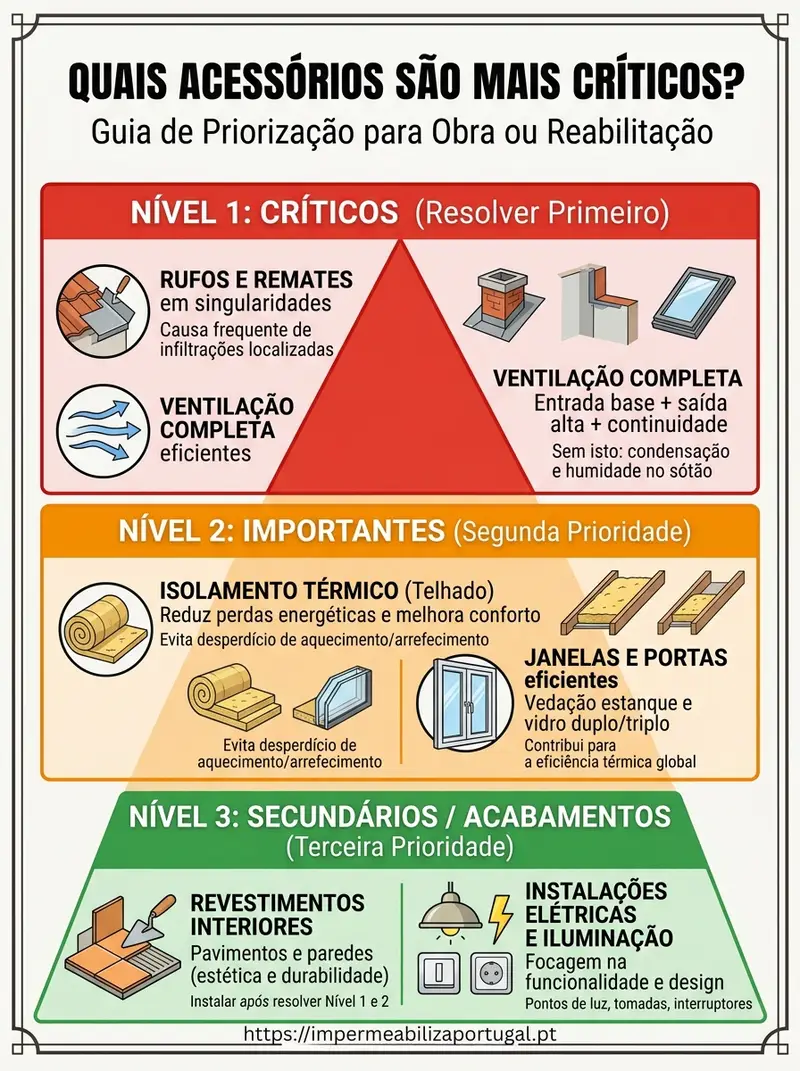 Em reforço de cobertura, os acessórios devem ser pensados em conjunto com o sistema de impermeabilização. Para métodos e contexto, veja impermeabilizar um telhado.