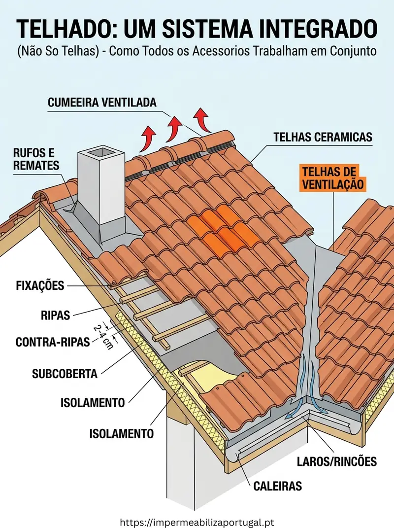 Se um destes elos falha, o resto do telhado “puxa” o problema — por isso fala-se em telhado como sistema, não como lista de peças soltas.