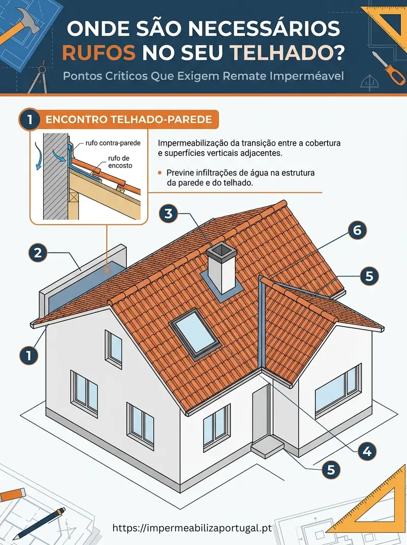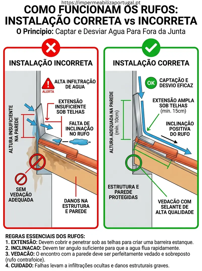 Em Portugal, a combinação de chuva sazonal intensa, vento costeiro e parque edificado envelhecido aumenta a importância dos rufos bem executados, sobretudo em moradias com remates antigos. Em zonas litorais, a exposição acelera desgaste de selagens e pode exigir materiais e manutenção mais rigorosos.