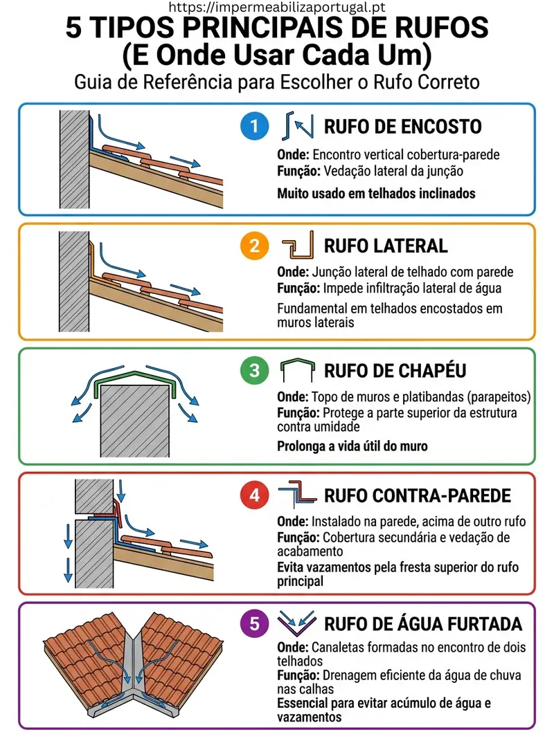 | Tipo de rufo | Onde se aplica | Função | Problema quando falha |
