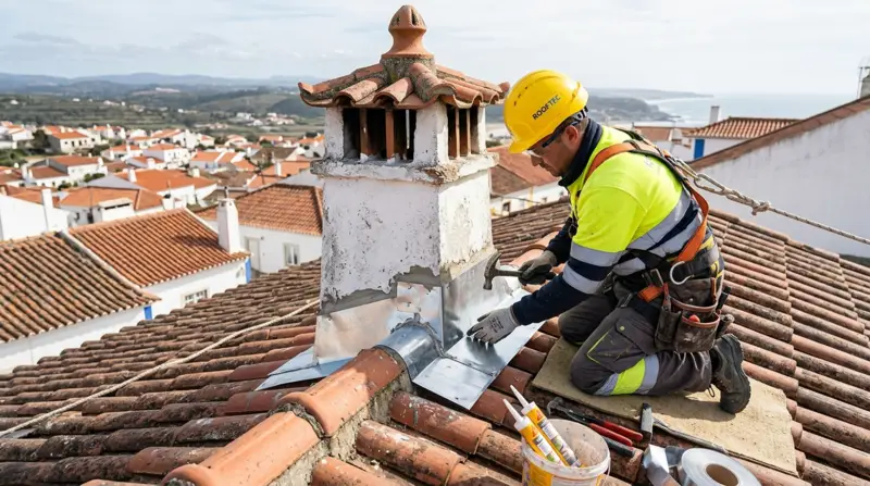A base da chaminé é um ponto de entrada frequente quando o remate está degradado ou mal executado.